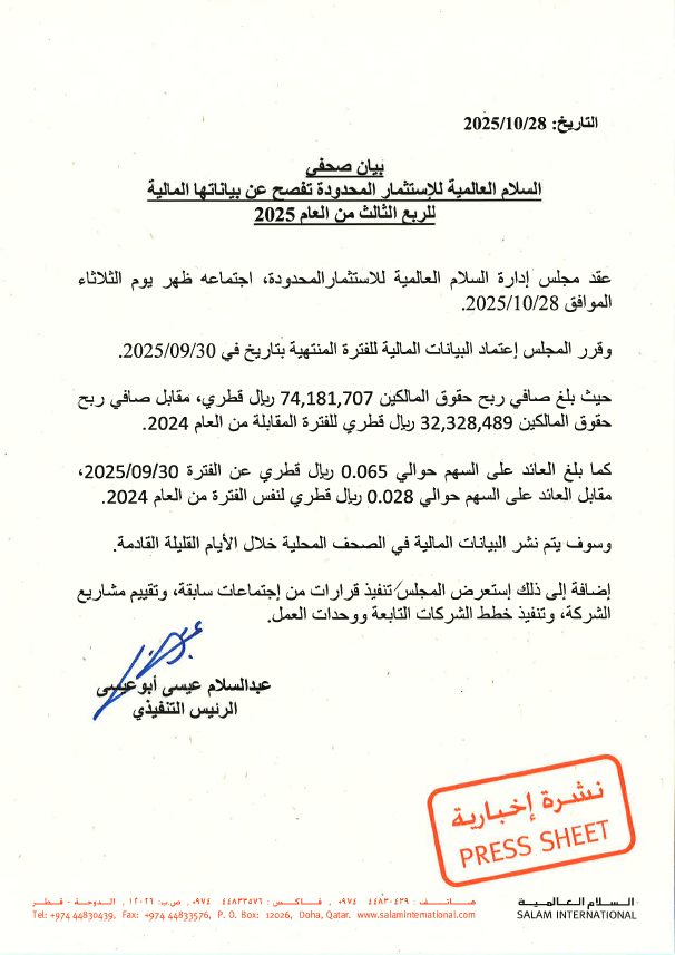أكتوبر 28, 2025 بيان صحفي حول نتائج الربع الثالث من العام 2025 Media PDF SIIL-BOD-PR-28-10-2025-Ar.pdf pdf - 71.50 كيلوبايت تحميل