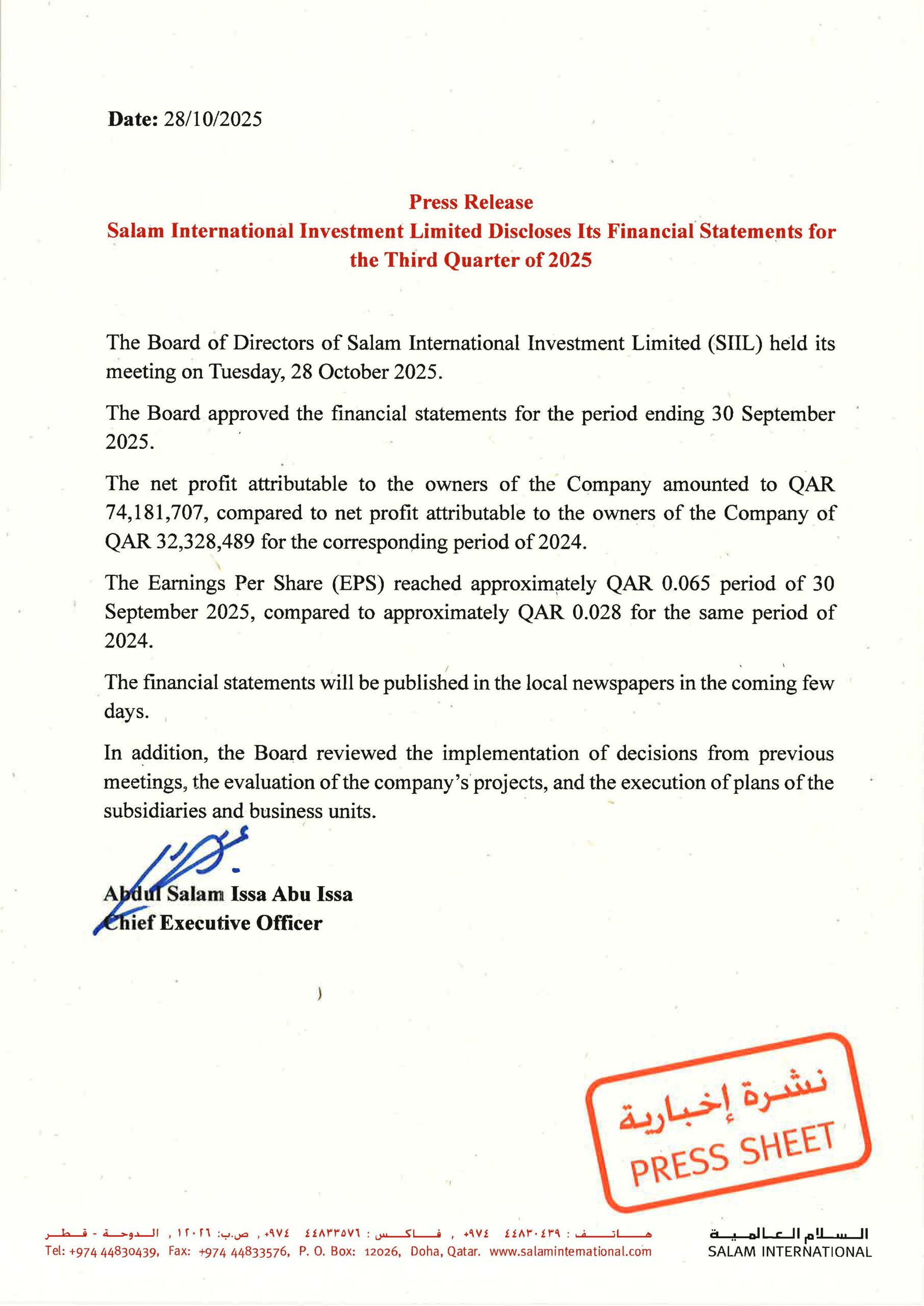Salam International Investment Limited Discloses Its Financial Statements for the Third Quarter of 2025